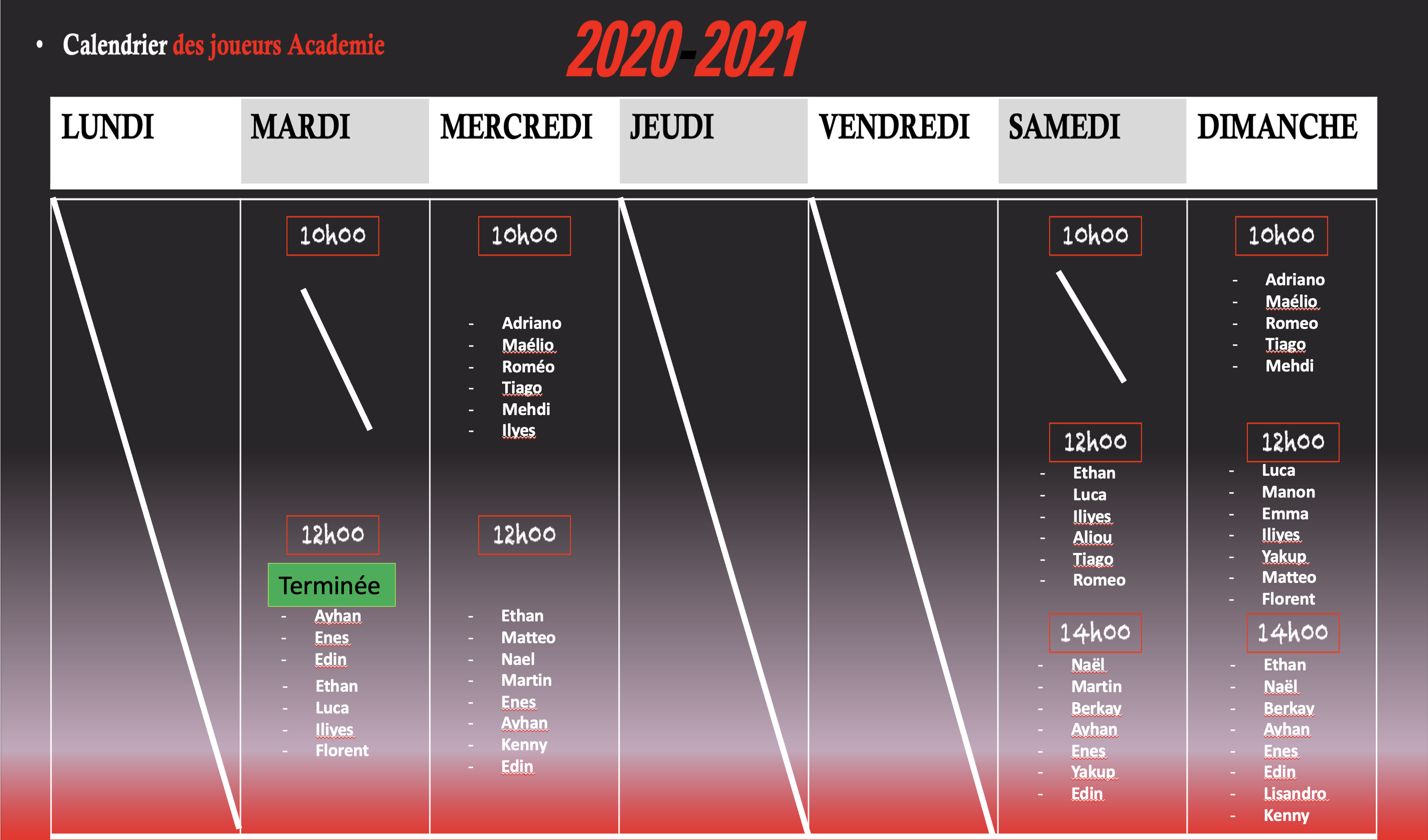 Programmes / horaires des entraînements pour les vacances de Noël :